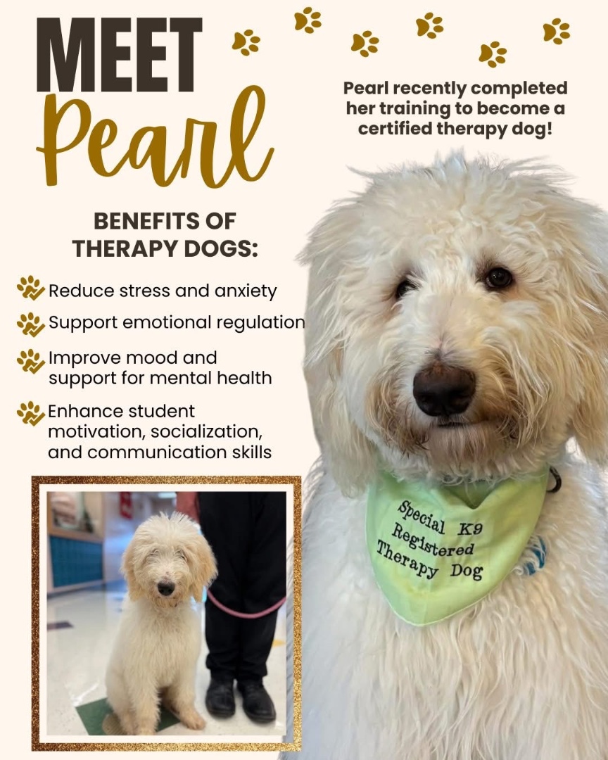 We'd like to officially introduce our therapy dog, Pearl! Mr. Reed and his wife, Robin, are registered handlers and Pearl recently completed her training at Special K9 Dog Training to become a certified therapy dog. Therapy dogs provide so many beneficial supports to students in school settings and we are so happy to have her. Our students and staff love seeing Pearl in the hallways! Welcome, Pearl!